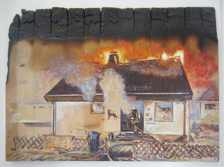 Es brennt - Mein klein Häuschen - Ein halbes Leben Arbeit, Öl auf Holz, von oben gebrannt, 56 x 68 x 4, 2014
