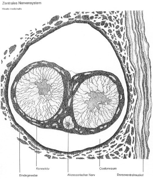 Querschnitt durch das zentrale Nervensystem von Hirudo Medizinalis, dem medizinischen Blutegel, Zeichnung in Tusche/Feder