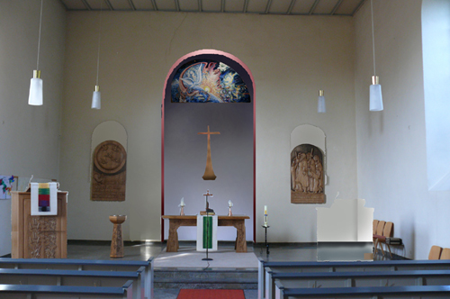 Das geschwungene Holzkreuz ist mit seinen Aussenkanten in Parabelform generiert aus den geometrischen Verhältnissen des Rundbogens darüber.