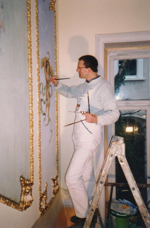 Im Treppenhaus der Wiesbadener Villa von Peter Hartung wurden unter alten Tapeten Wandmalereien gefunden.