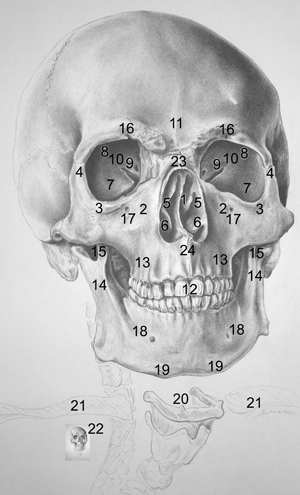 Die beiden Foramen supraorbitale (16), (über dem Auge) müssten